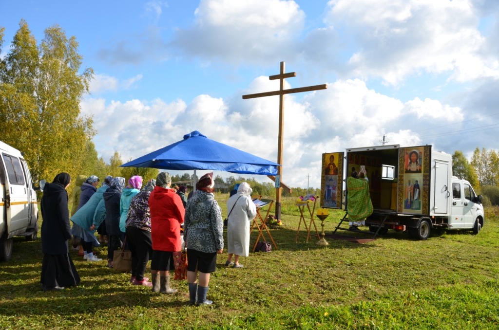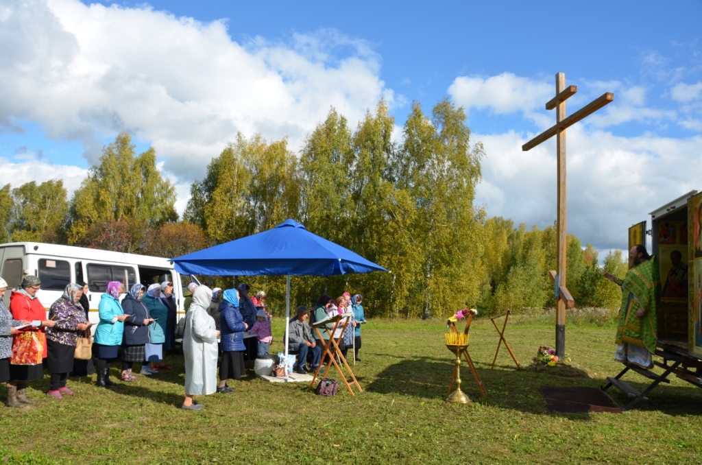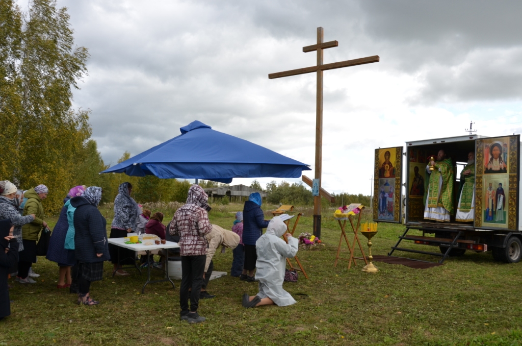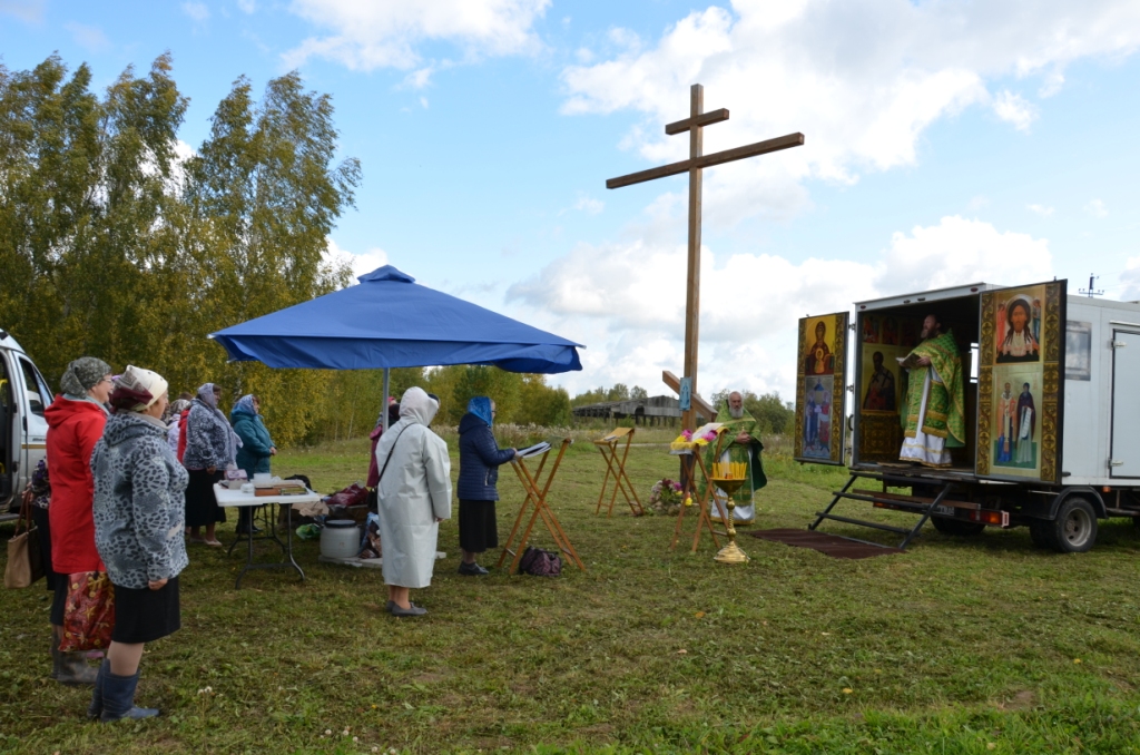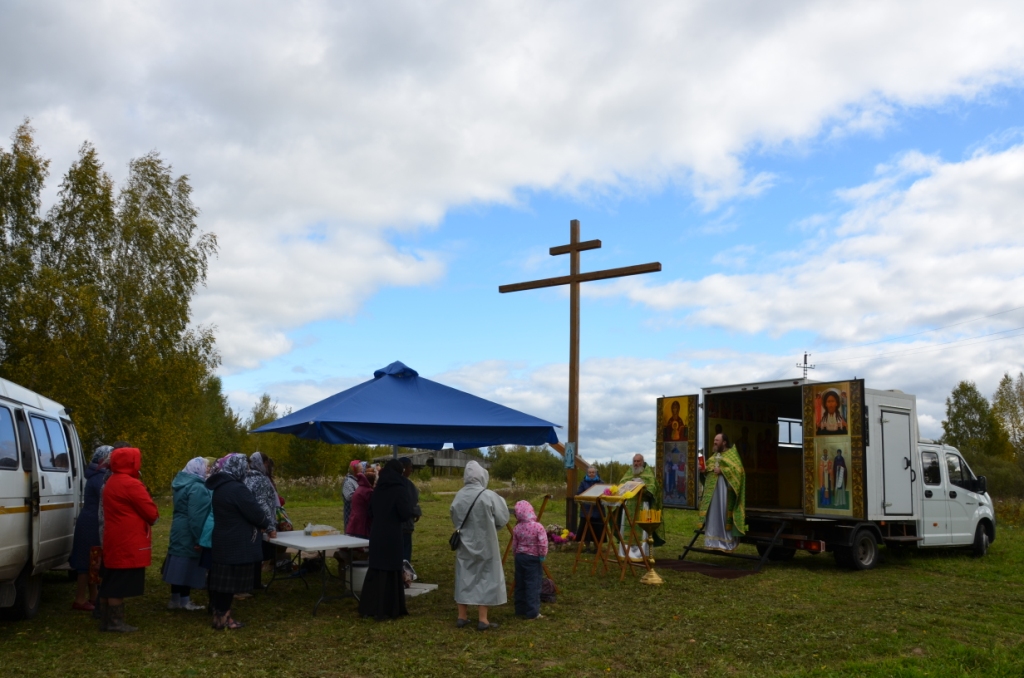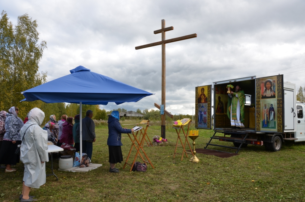 Богослужение совершалось в передвижном храме св. равноап. вел. кн. Владимира. Ранее на месте утраченных храмов трудами благочинного Лухского округа иерея Евгения Галкина и благотворителей был установлен поклонный крест.